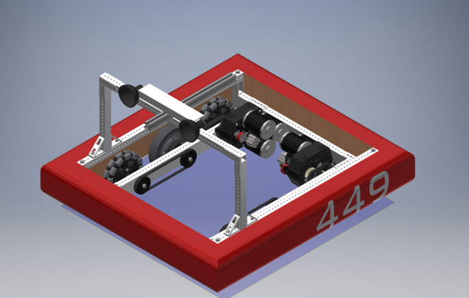 The drive team reassembled the VexPro 3 CIM Ball Shifter gearboxes that the team used throughout the 2018 season and had formerly disassembled and cleaned. They also worked with the CAD lead to get preliminary dimensions and parameters for the drivetrain, which were fed into the team's drivetrain CAD generator to quickly produce a drivetrain CAD in record speed, ready for fabrication. The frame was set at 31.5" long by 27.5" wide, leaving us with a perimeter 2" smaller than the maximum legal frame perimeter. Since the field was similar to the 2018 field, the team chose to go with the same gearings, wheel size, and wheel configuration that were used in 2018.